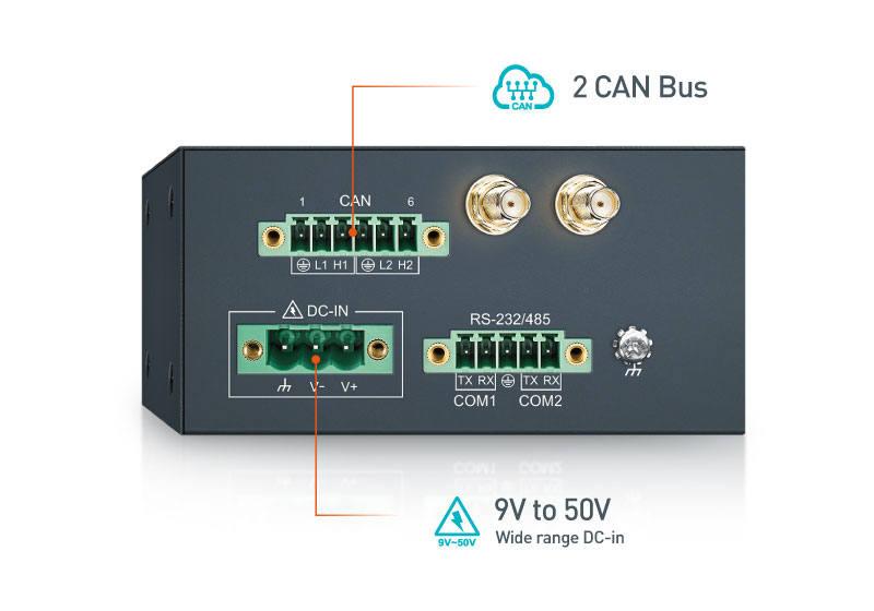 NXP i.MX6ULL Arm Cortex-A7 Processor, 512MB SDRAM, 512MB Flash, 2 LAN, 1 USB 2.0, 2 COM RS-232/485, 1 Micro SD, 1 Nano SIM, 2 CAN, 12 Isolated DIO