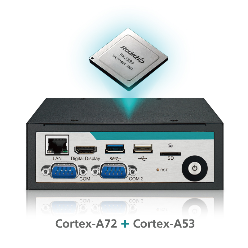 Powered by Arm dual-core Cortex-A72 and quad-core Cortex-A53 processor, Vecow EIC-1000 provides high-performance computing and energy-saving in a compact design. With 9V to 55 DC-in, fanless, 0°C to 70°C operating temperature supported, EIC-1000 is ideally suited for Digital Signage, Factory Automation, Smart Retail, and any AIoT/Industry 4.0 applications.